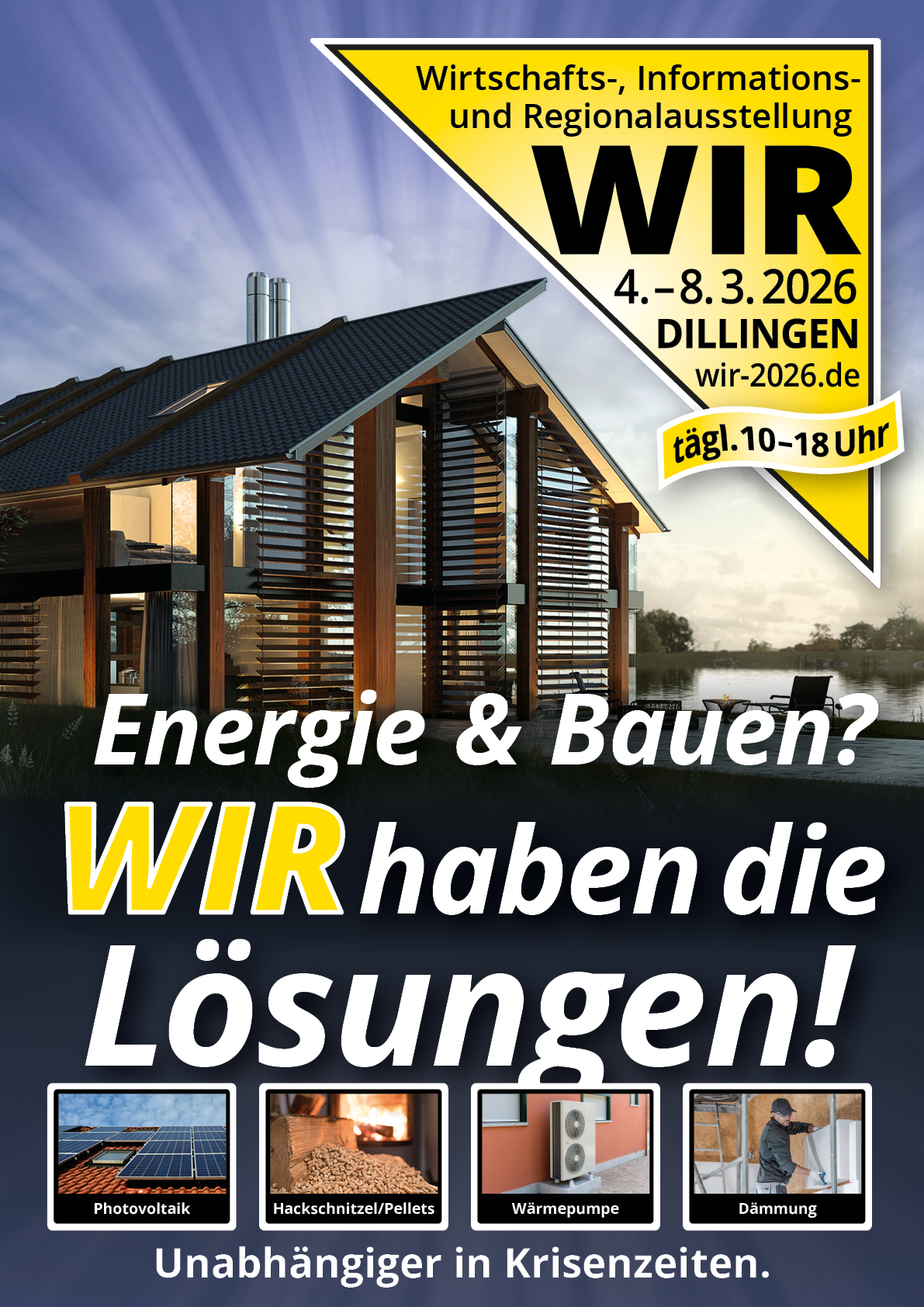 Auf der WIR Dillingen vom 04.03. bis 08.03.2026 dreht sich alles um die Energiezukunft – verständlich, praxisnah und zum Anfassen. Freuen Sie sich auf einen starken Themenmix mit Photovoltaik, smarten Energielösungen und modernen Konzepten rund ums Zuhause: von Eigenstrom & Speicher über intelligentes Energiemanagement bis hin zu effizienten Lösungen wie der Wärmepumpe.